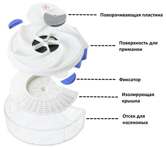 - Попавшие на поверхность ловушки насекомые при вращении пластины сразу переносятся в емкость, расположенную с нижней стороны.