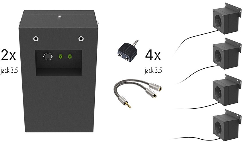 - 2 аудиовыхода для подключения внешних динамиков. Устройство поддерживает подключение до 4-х колонок (докупаются отдельно), которые позволяют значительно расширить площадь распространения звука. 1 или 2 динамика присоединяются напрямую в разъемы, а для подключения 3 или 4 колонок необходимо использовать переходники на 2 гнезда jack 3.5 мм.