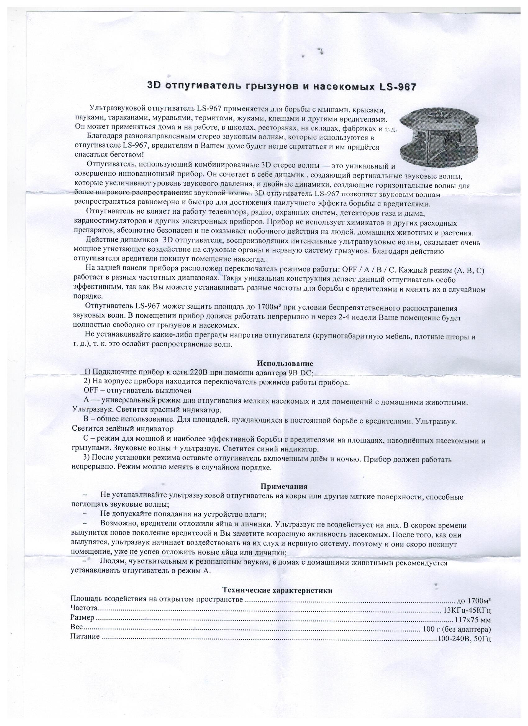 Ультразвуковой отпугиватель грызунов «Экоснайпер LS-967»